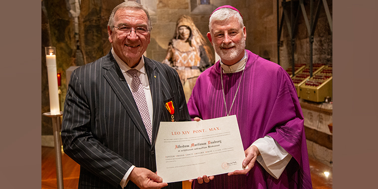 BRISBANE Archbishop Shane Mackinlay conferred an award from Pope Leo XIV on Australian Catholic University chancellor Martin Daubney at a Mass at St Stephen's Chapel...